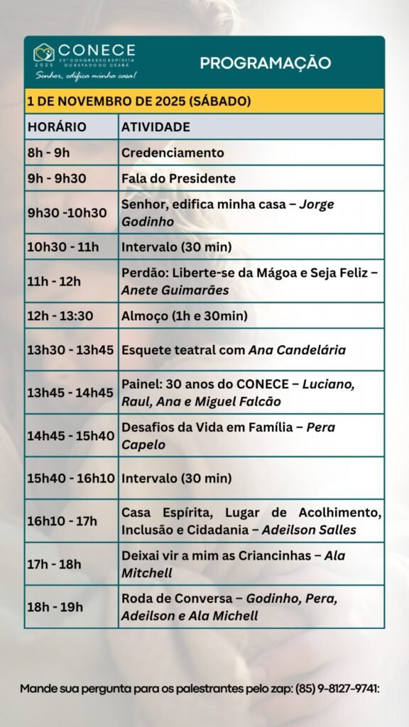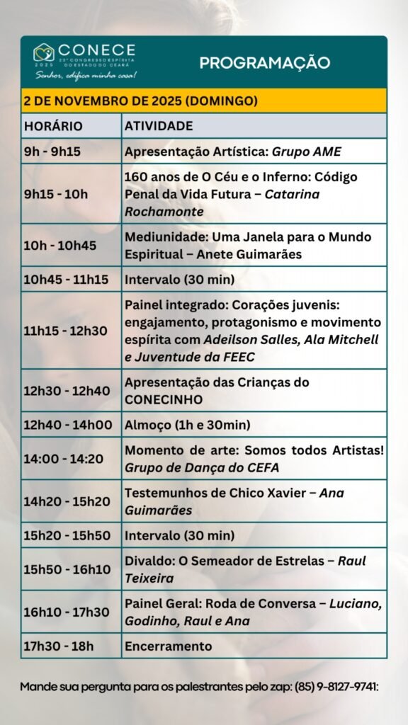 Você é nosso convidado especial para o 23º Congresso Espírita do Estado do Ceará – CONECE e é com grande alegria que divulgamos a programação para os dias 1 e 2 de Novembro de 2025.